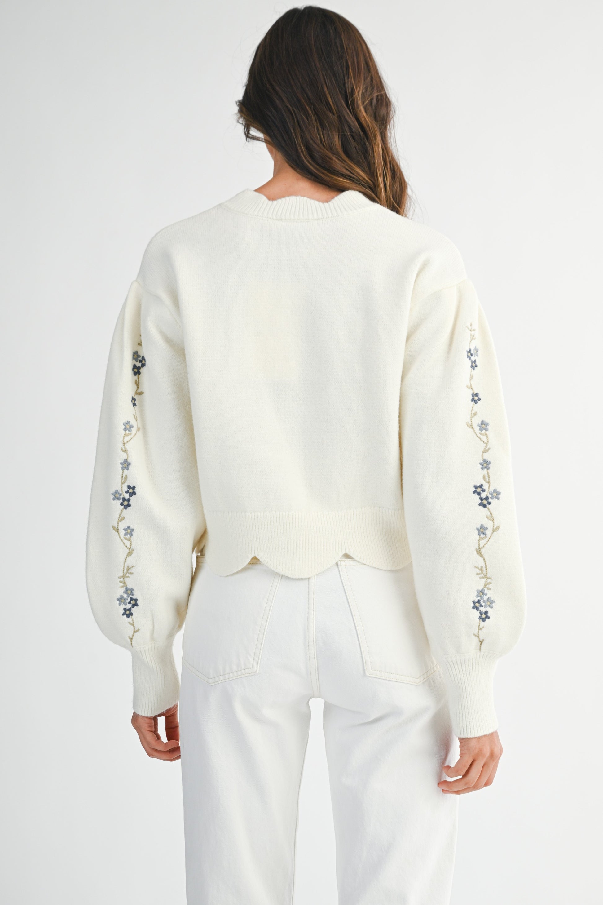 Long sleeve floral embroidery detail scalloped hem and neckline sweater knit top.