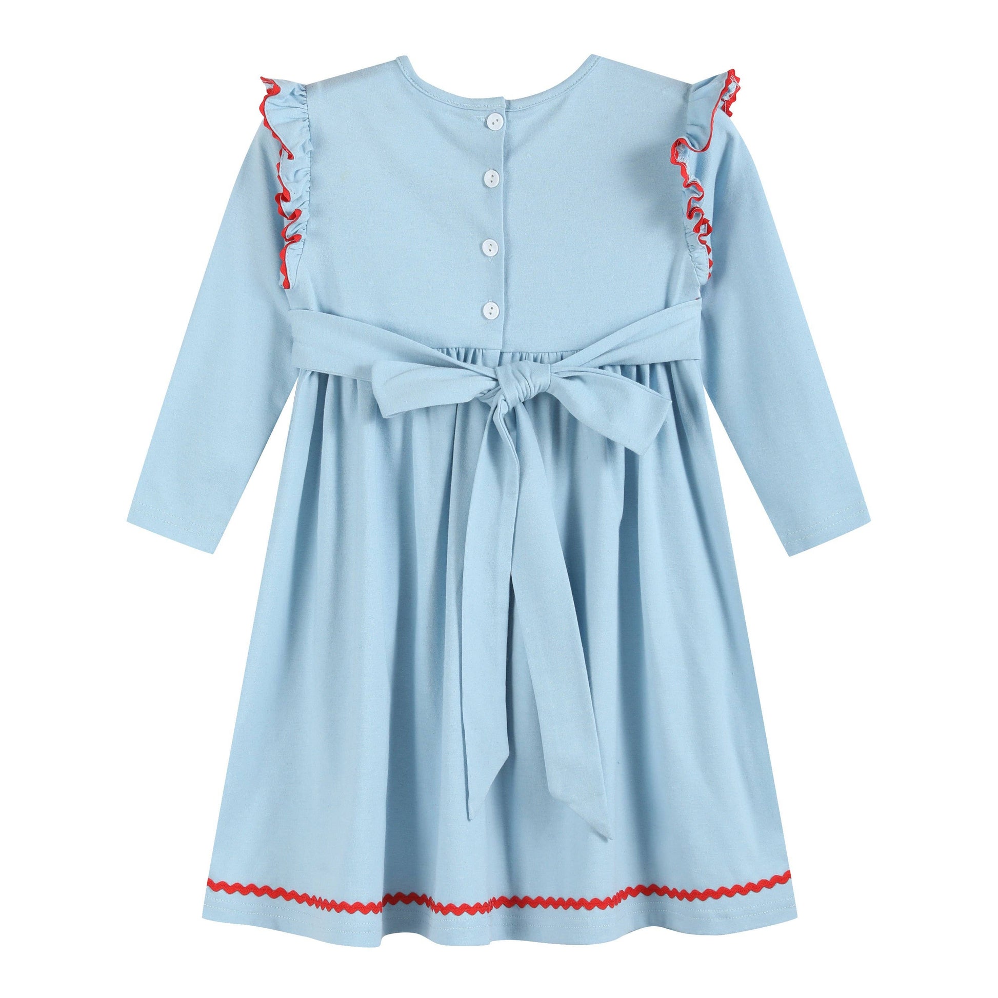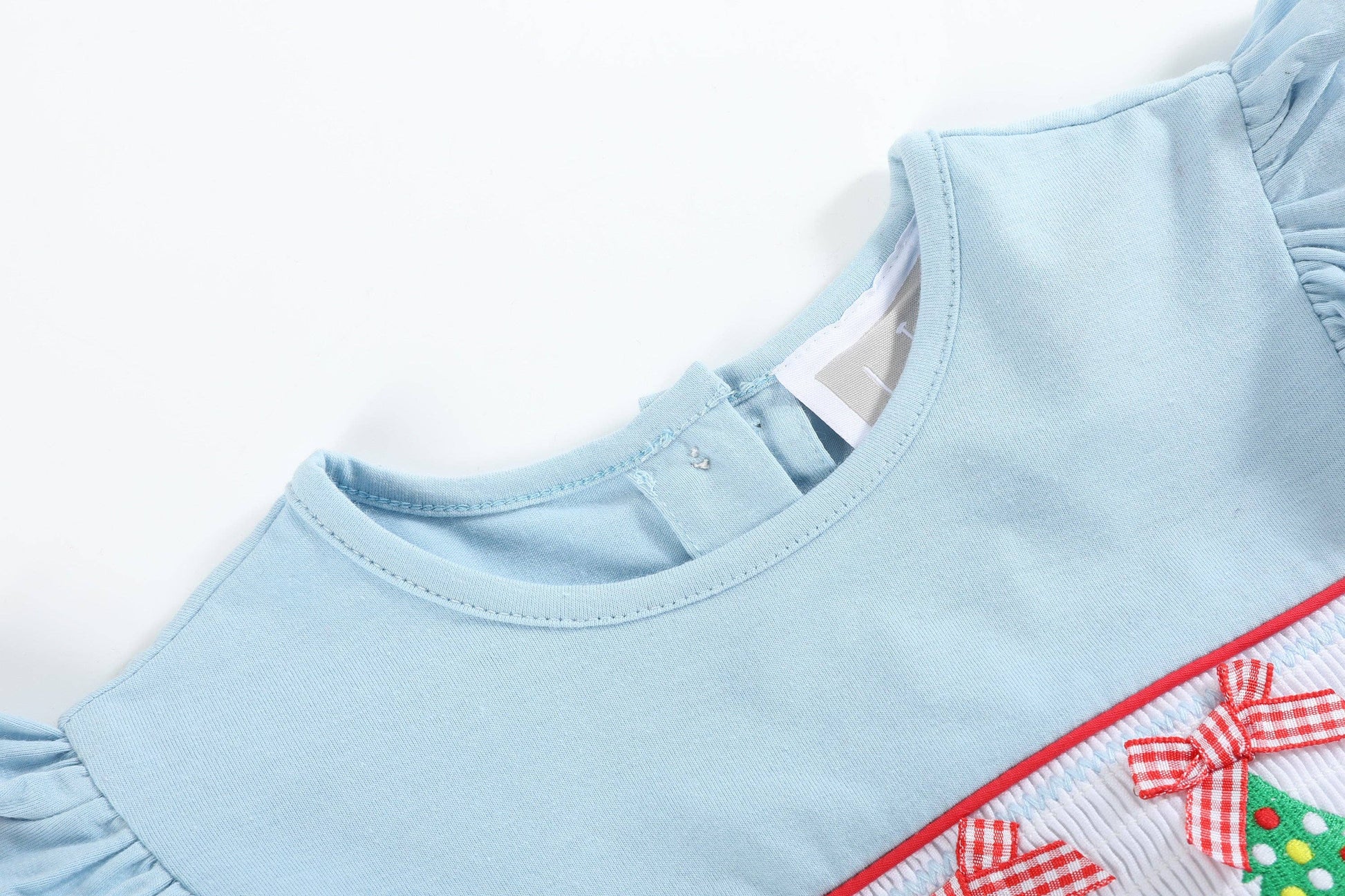 Celebrate the holiday season in style with this cheery Light Blue Christmas Tree Smocked Knit Dress! Featuring delightful ruffle details and smocking adorned with embroidered Christmas trees and tiny bows, it’s brimming with festive charm. The rickrack trim adds a playful touch, making this dress perfect for holiday gatherings, photos, and joyful moments. Soft and cozy, it’s designed for comfort and holiday cheer!