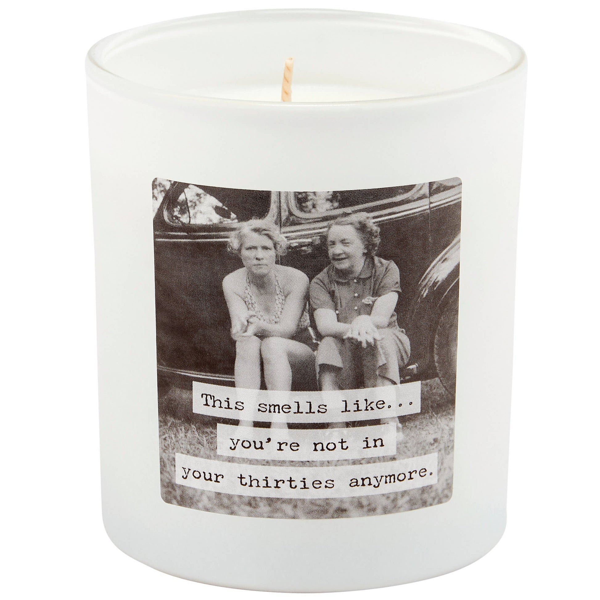 A candle from our Trash Talk By Annie Collection displaying a double-sided design of a vintage black and white photograph on frosted white glass complemented with a humorous sentiment that reads "This Smells Like... You're Not In Your Thirties Anymore." Candle features soy-based wax and a cotton wick with 35 hours of burn time activating a refreshing Fresh Linen scent. Our Not In Your Thirties candle includes a dust cover and plastic lid for protection and polished appearance. A hilarious home accent that is great for everyday gifting.