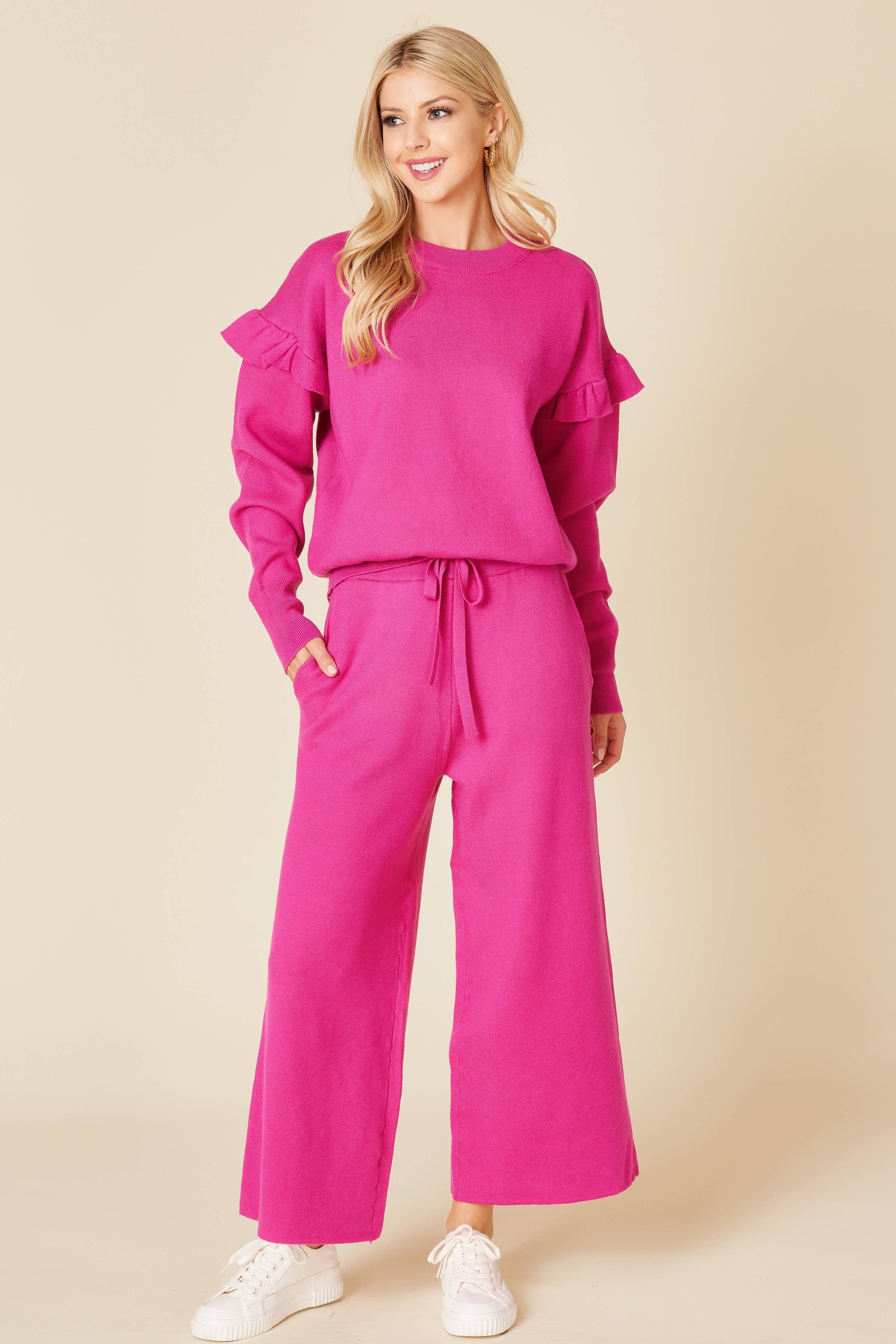Solid sweater top and pants matching set. The top features round neck, ruffled shoulder detail, cuffed long sleeves and cuffed hem. The bottom pants features banded waistline, matching drawstring, wide legs and ankle length.