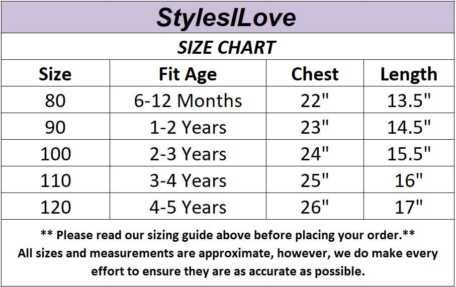 Sizes: 6–12 Months, 1–2T, 2–3T, 3–4T, 4–5T
